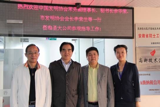 培訓(xùn)期間,余華榮常務(wù)副理事長(zhǎng)在蕪湖圣大醫(yī)療器械技術(shù)股份有限公司考察,右二為企業(yè)創(chuàng)始人、發(fā)明人商建忠,左一為蕪湖市發(fā)明協(xié)會(huì)會(huì)長(zhǎng)李榮生,右一為蕪湖高新技術(shù)創(chuàng)業(yè)服務(wù)中心主任張?jiān)?